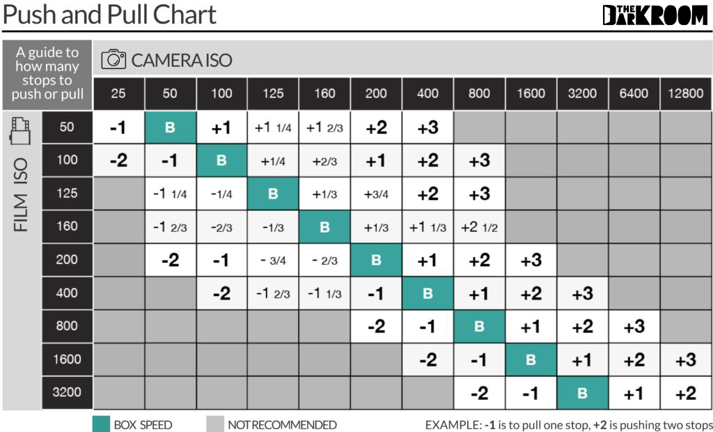 This chart simplifies how many stops a film is pushed or pulled when changing the ISO. For example, 400 ISO film set at 800 on your camera is 1 Stop (+1).