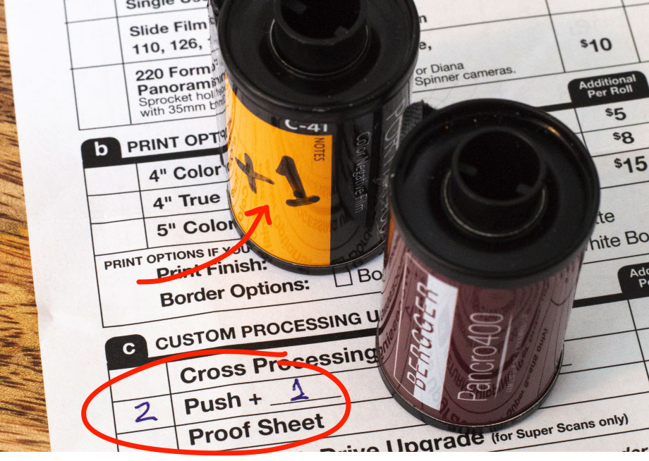 When the film is developed, Pushed film is left longer in the developer and Pulled film shorter, compensating for the different ISO setting, underexposing or overexposing film. Because Push and Pull processing time matters, it’s important to give instructions to the film lab and have the canister marked.